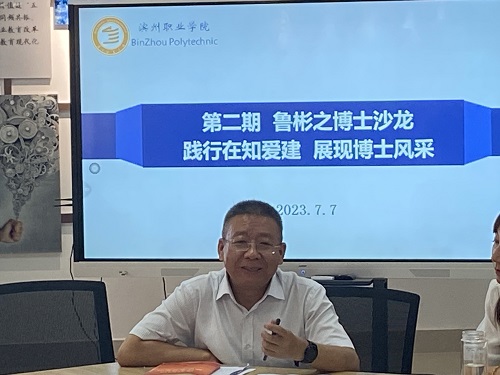 7月7日,第二期博士沙龙在鲁彬之现代职业教育研究工作室举办。本次活动以“践行在知爱建 展现博士风采”为主题,党委委员、滨州应用科技研究院院长胡洪涛主持。