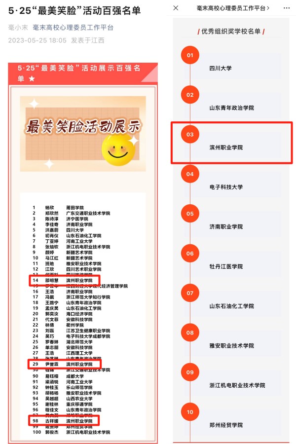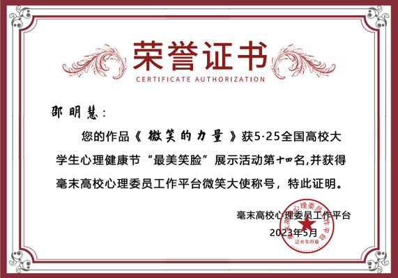 近日,由毫末高校心理委员工作平台、四川大学心理健康教育中心举办的5·25全国高校大学生心理健康节“最美笑脸”展示活动圆满结束。我校3名学生入围百强,我校以第三名的位次获得“优秀组织奖”。