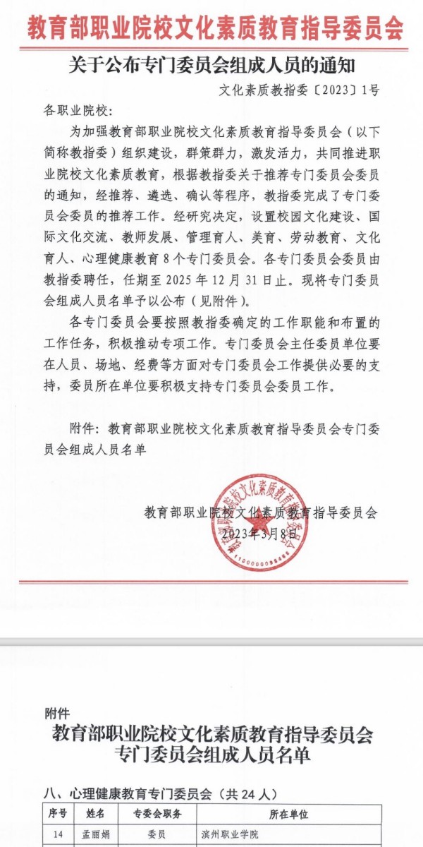 教育部职业院校文化素质教育指导委员会《关于公布专门委员会组成人员的通知》公布了新一届专门委员会委员名单,我校学生工作处心理健康教育中心孟丽娟老师当选为教育部职业院校文化素质教育指导委员会心理健康教育专门委员会委员。