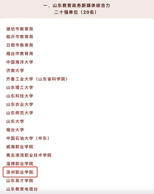 2023年3月,山东省教育厅印发《关于表扬2022年全省教育系统新闻宣传工作先进单位的通报》,我校新闻宣传工作表现突出,获评2022年度山东教育系统新闻宣传工作先进单位。此外,我校还获评“2021-2022年度山东教育政务新媒体工作先进二十强单位”;宣传思想工作特色案例《“新闻+”的可视化传播实践探索》获评“山东省新闻宣传工作优秀案例”;“滨州职业学院”微信公众号荣获2022“山东教育融媒TOP100优秀教育账号”;蝉联滨州市“十佳政务微信(市直)”“十佳政务微博”“十佳政务抖音”称号。