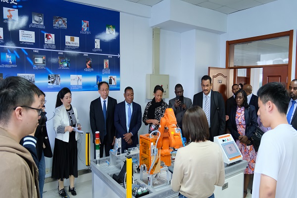 4月26日下午,非洲教育团一行参观了我校校史馆。在校史馆,外宾们认真倾听了关于滨职历史、办学理念以及特色专业办学成果的全英文讲解,对我校取得的成绩表示高度赞赏。教育团来到先进控制技术工程中心,近距离参观了“ABB工业机器人协同创新中心”、“西门子先进自动化技术中心”、“现代电气认证训练中心”、“先进控制技术研发中心”,先进的实训设备和环境给外宾留下深刻印象。省委外办副主任孙业宝,省委外办非洲处处长、二级巡视员李红,市政府副秘书长张松林、市外办主任苏涛参加活动,滨州职业学院院长申保忠,党委委员、滨州应用科技研究院院长胡洪涛,国际学院院长、国际交流与合作处处长李毓娣陪同参加。