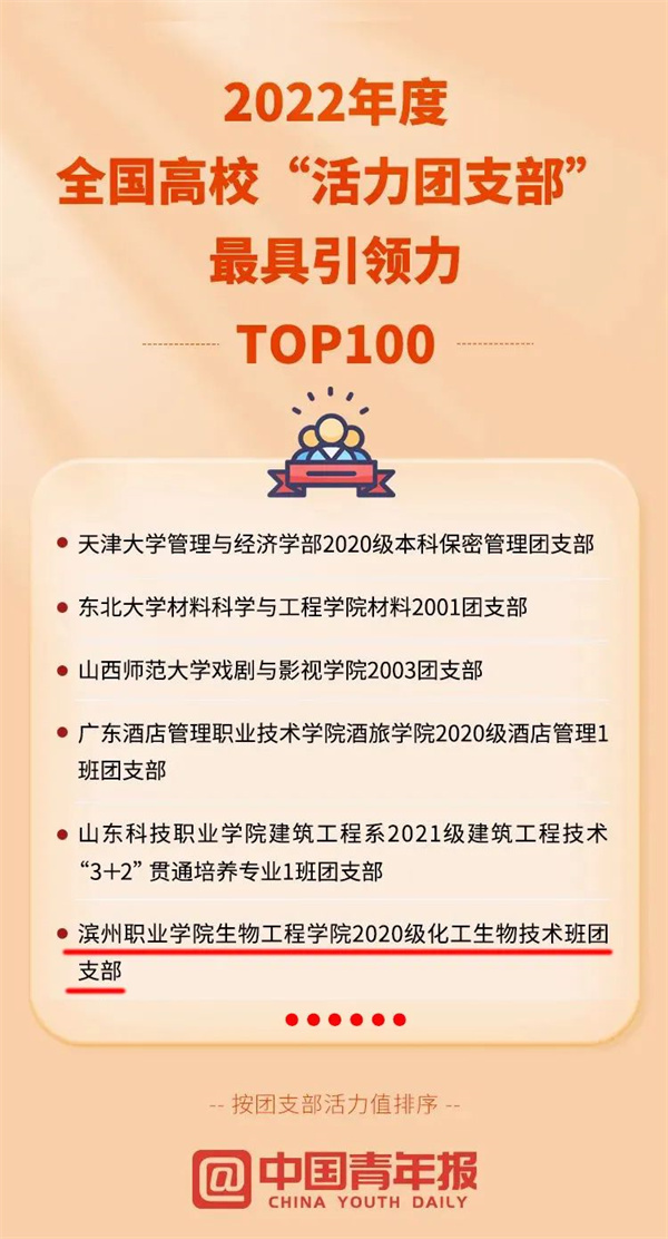 2020级化工生物技术团支部成功入选2022年度全国高校“活力团支部”最具引领力TOP10榜是对我校基层团组织规范化建设成果的肯定。下一步,校团委将按照我校共青团“11431”的全年总体工作思路,暨以“学习宣传贯彻党的二十大精神”为主线,围绕“党建领航团建”这一行动准绳,实施“青春铸魂、青春强基、青春赋能、青春建功”四大工程,助推滨职共青团“组织力、引领力、服务力”三力提升,聚焦“大局贡献度”,全面推进从严治团,以对标定位、创先争优为标准,以擦亮团学工作品牌为目标,稳步推进团学组织规范化建设,打造与“双高校”同频共振的共青团工作新局面。(团委)