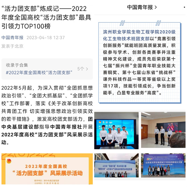 近日,我校推报的生物工程学院2020级化工生物技术团支部成功入选2022年度全国高校“活力团支部”最具引领力TOP10榜,并被中国青年报专题报道。