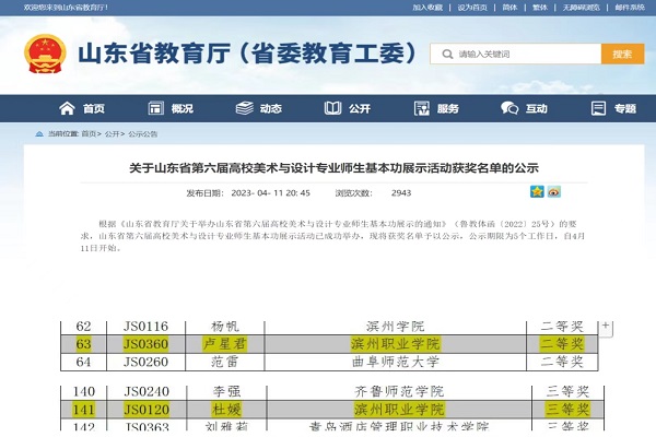 近日,山东省教育厅省委教育工委公布“山东省第六届美术与设计专业基本功”展示活动获奖名单,我院两名教师获奖。其中卢星君老师荣获教师组二等奖、杜媛老师荣获教师组三等奖。