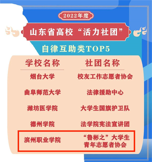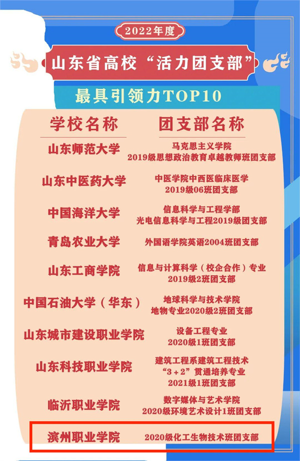 近日,山东省学生联合会在公众号发布2022年度山东省高校“活力团支部”“活力社团”榜单,我校推报的2020级化工生物技术团支部、“鲁彬之”大学生青年志愿者协会分别入选山东省高校“活力团支部”最具引领力TOP10榜单和“活力社团”自律互助类TOP5榜单,入选数量位居全省高校前列。