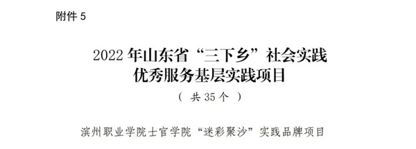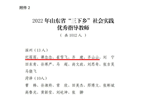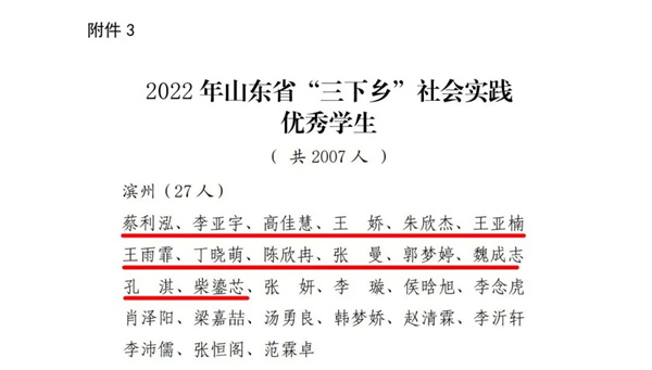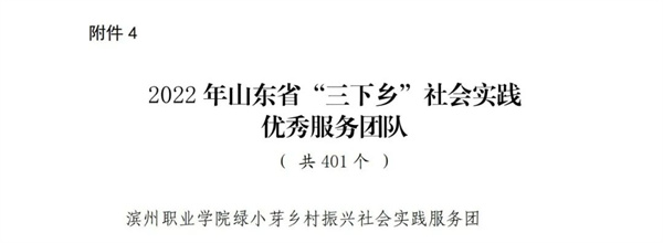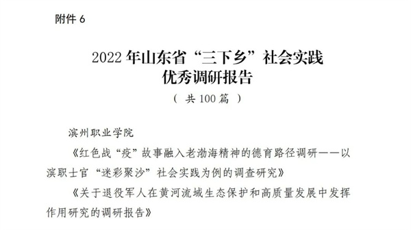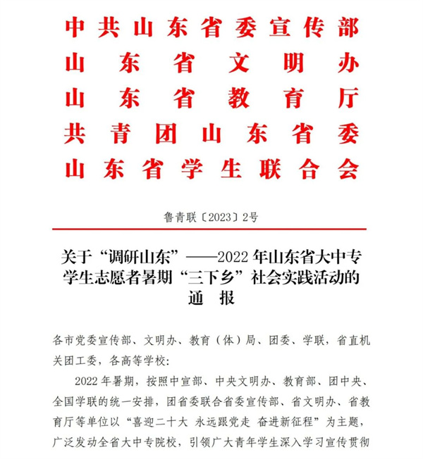 2月20日,省委宣传部、省精神文明建设委员会办公室、省教育厅、团省委、省学联联合下发《关于“调研山东”—2022年山东省大中专学生志愿者暑期“三下乡”社会实践活动的通报》(鲁青联〔2023〕2号),公布了在 2022 年“三下乡”社会实践活动中表现突出的优秀集体、个人和项目,其中校团委荣获2022年度全省三下乡社会实践优秀单位;我校1个社会实践品牌项目入选全省35个优秀服务基层实践项目,2篇社会调研报告入选全省高校100篇优秀报告,1个实践团队荣获全省优秀服务团队;另有5名教师、14名学生获评“优秀”;所获奖项位列全省高职院校前列。