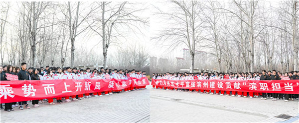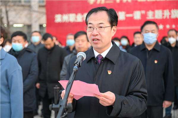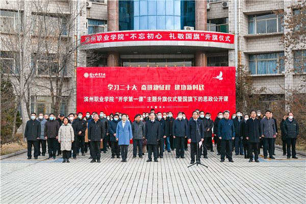 本网团委、信息工程学院讯 为充分激发广大师生爱党爱国情怀,强化爱校荣校意识,不忘初心、牢记使命,积极投身于学校“双高”建设和“升本”创建工作。2月13日,我校在太阳广场举行“学习党的二十大 奋进新征程 建功新时代”——滨州职业学院“不忘初心 礼敬国旗”新学期“开学第一课”主题教育活动升旗仪式。党委书记刘荩一出席活动并讲话,党委副书记、院长申保忠主持仪式,党委副书记李岩,党委委员、副院长宣永华,党委委员、滨州应用科技研究院院长胡洪涛,副院长李明月,党委委员、宣传部部长杨玉梅出席活动。