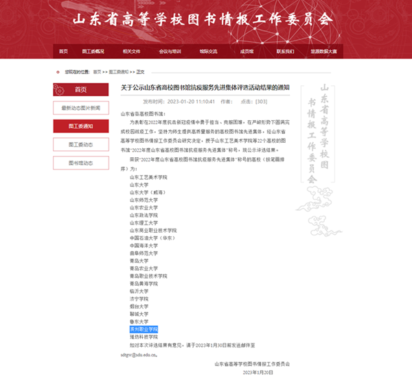 我校图书馆获2022年度山东省高校图书馆抗疫服务先进集体称号