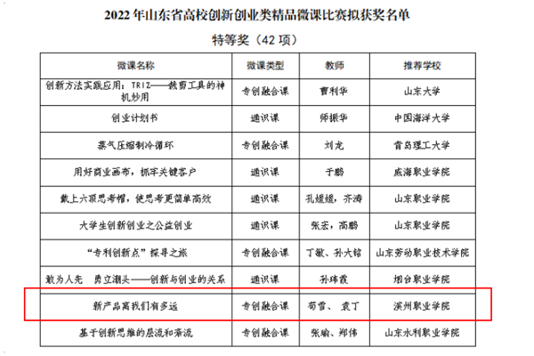 近日,省教育厅官网公布了山东省高校创新创业类精品微课比赛获奖名单,我院推荐的4门微课全部获奖,其中获得特等奖1项、一等奖1项、二等奖2项。工商管理学院苟雪、袁丁老师讲授的专创融合课《新产品离我们有多远》获得大赛特等奖,工商管理学院程文秀老师讲授的专创融合课《“遇见非遗”直播间之互动技巧》获得大赛一等奖;士官学院闫姝月老师讲授的通识课《正确认识知识产权规避创业中的风险问题》和士官学院褚云峰老师讲授的通识课《“奥斯本检核表法”的正确使用》均获得大赛二等奖。