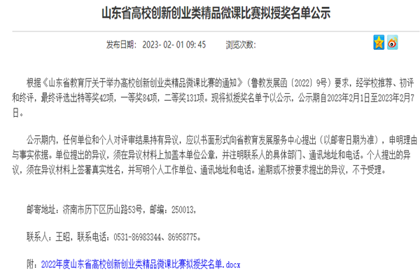 本次大赛由省教育厅举办,是在进一步深化我省高校创新创业教育改革背景下,提升教师创新创业教育教学能力而组织的创新创业类微课比赛。大赛按照创新创业教育通识课、专创融合课进行分组,从规范性、教学设计和教学效果三个层面对参赛作品进行评审;经学校推荐、专家初评和终评,最终评选出特等奖42项,一等奖84项,二等奖131项。获奖精品微课将纳入山东省高校创新创业类精品微课课程资源库并向社会免费开放。