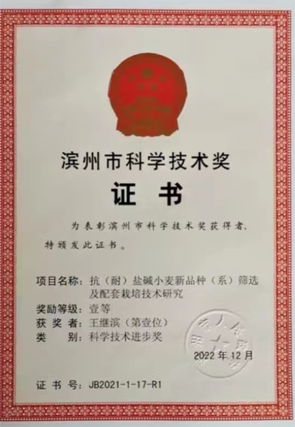 我校种质资源研究中心立足黄河三角洲地区,选育和筛选适宜当地土壤、气候条件的作物新品种(系),重视和加强研究成果在农业生产中的推广应用,实现研究成果转化为现实生产力,促进本地区农业农村发展,不断取得新成绩,近日,我校农学专家王继滨教授主持的《抗(耐)盐碱小麦新品种(系)筛选及配套栽培技术研究》成果荣获滨州市科技进步一等奖。