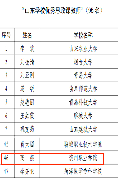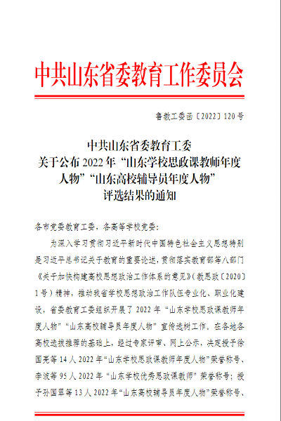 近日,省委教育工委公布2022年“山东学校思政课教师年度人物”评选结果,马克思主义学院高燕教授获评“山东学校优秀思政课教师”。