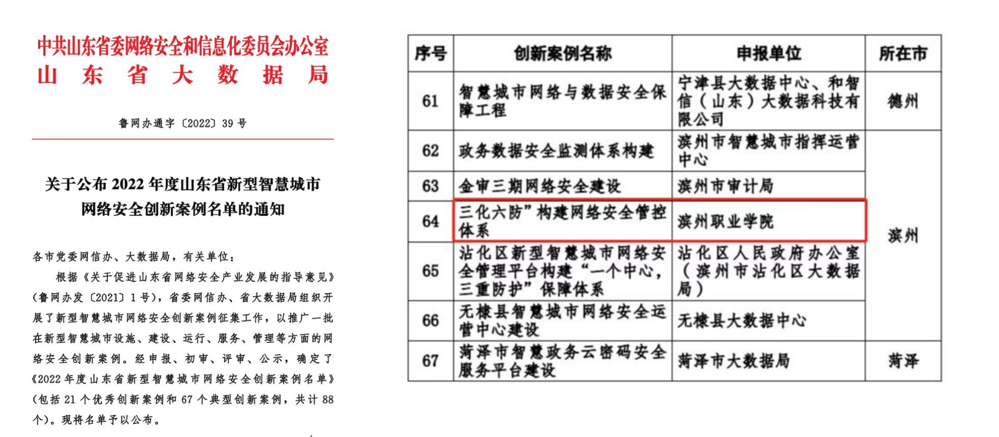 近日,中共山东省委网络安全与信息化委员会办公室、山东省大数据局印发《关于公布2022年度山东省新型智慧城市网络安全创新案例名单的通知》,我院报送的《“三化六防”构建网络安全管控体系》经申报、初审、评审、公示,获评年度典型创新案例。