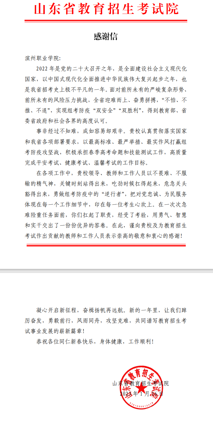 本网招生就业处讯 1月16日,山东省教育招生考试院向我院发来新春感谢信。对我院领导、教师和工作人员在2022年各项招生考试工作中表现出的不畏难、不服输的精气神表达敬意,对勇担责任、迎难而上,高质量完成春各项组考任务表示感谢,并对我院师生送上新春祝福。