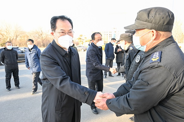 1月20日下午,滨州职业学院新任党委书记刘荩一,党委副书记、院长申保忠在党委委员、副院长宣永华陪同下,对校园安全情况进行检查,详细询问学院值班安排,实地查看设备运行情况,并走访慰问春节期间坚守岗位的安保和物业工作人员。