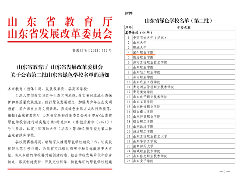 近日,从省教育厅、省发展改革委员会联合发布的《关于公布第二批山东省绿色学校名单的通知》鲁教财函〔2022〕117号中获悉,我院以高校第四名的成绩被评为“山东省绿色学校”。