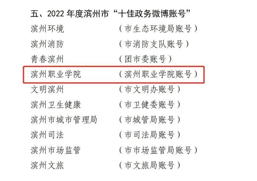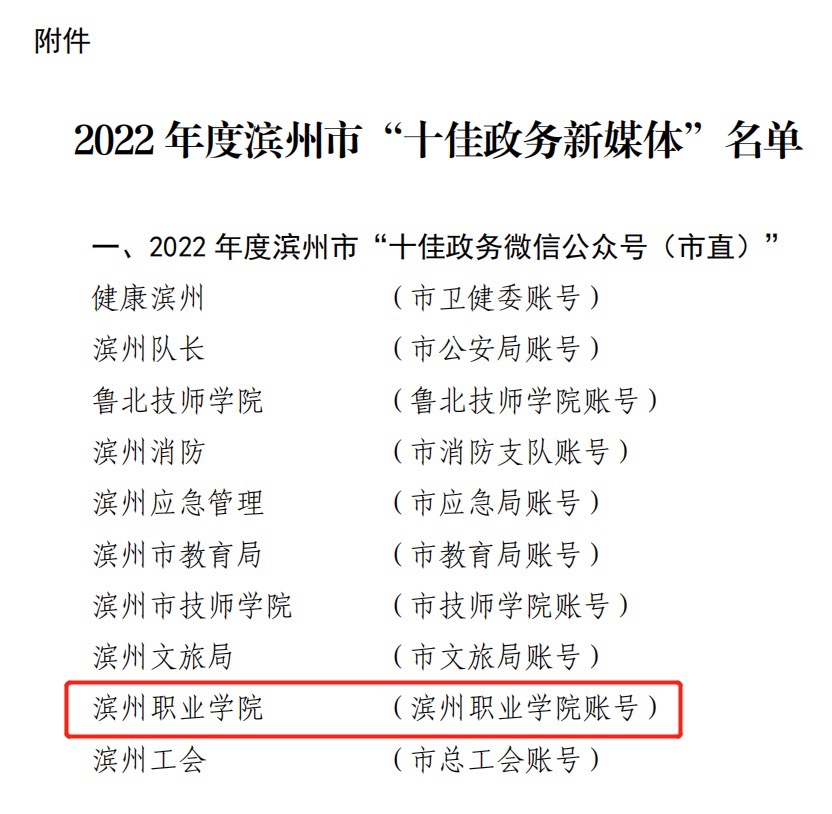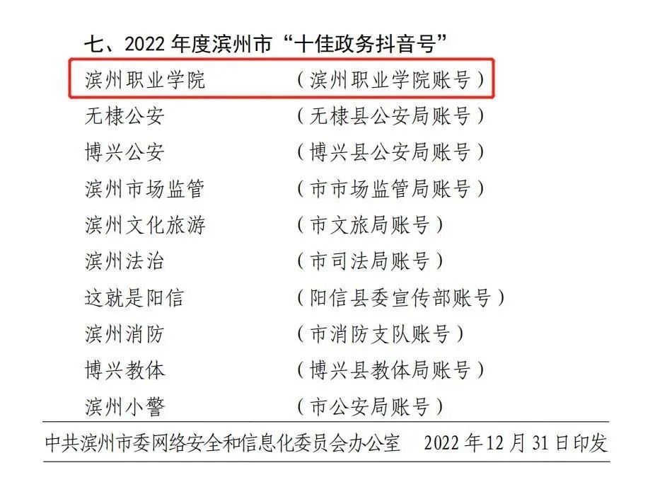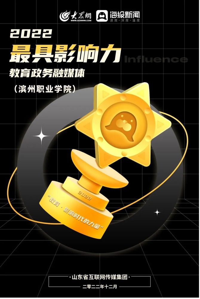 近日,市委网信办、市政府办公室联合公布了2022年度滨州市“十佳政务新媒体” 评选结果,我院喜获2022 年度滨州市“十佳政务微信公众号(市直)”、2022 年度滨州市“十佳政务微博账号”、2022 年度滨州市“十佳政务抖音号”三项大奖。同时,学院在山东省互联网传媒集团大众网·海报新闻发起“教育·影响时代的力量”年度榜单中获评“2022山东最具影响力教育政务融媒体”、“2022山东最佳社会声誉高校”称号。