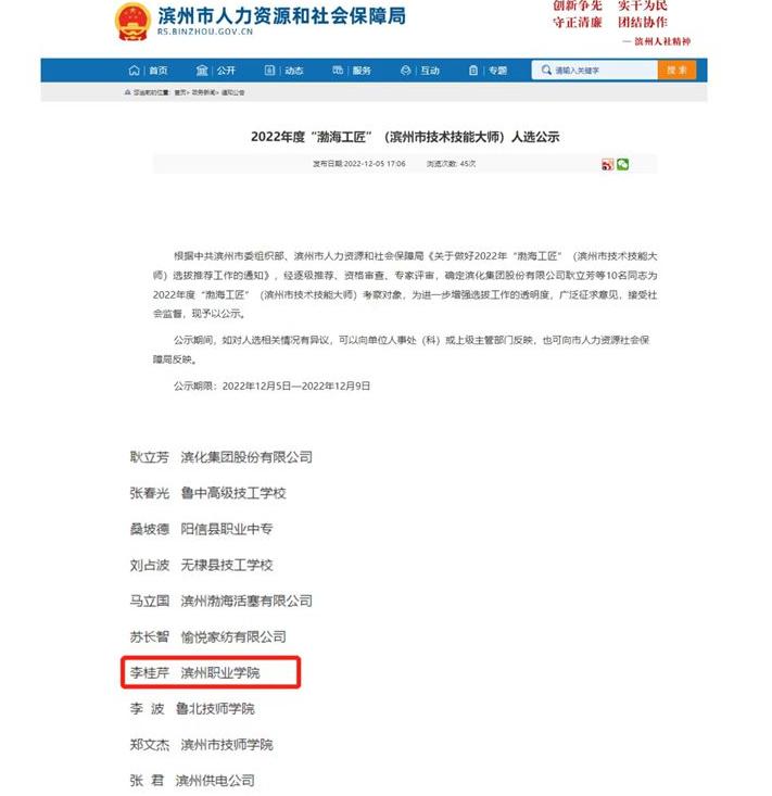 近日,根据中共滨州市委组织部、滨州市人力资源和社会保障局开展《关于做好2022年“渤海工匠”(滨州市技术技能大师)选拔推荐工作的通知》精神,经资格审查、专家评审、逐级推荐等环节,李桂芹同志获2022年度“渤海工匠”(滨州市技术技能大师)称号。