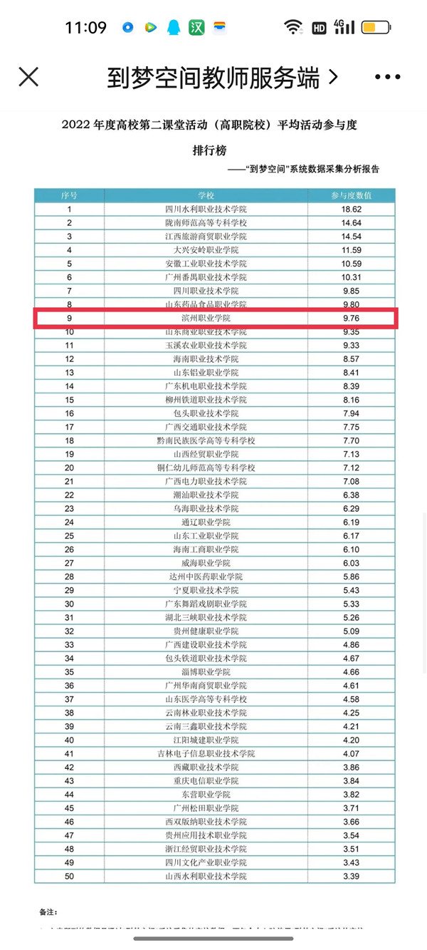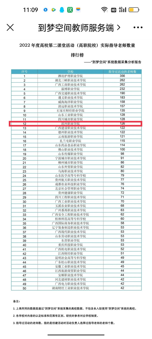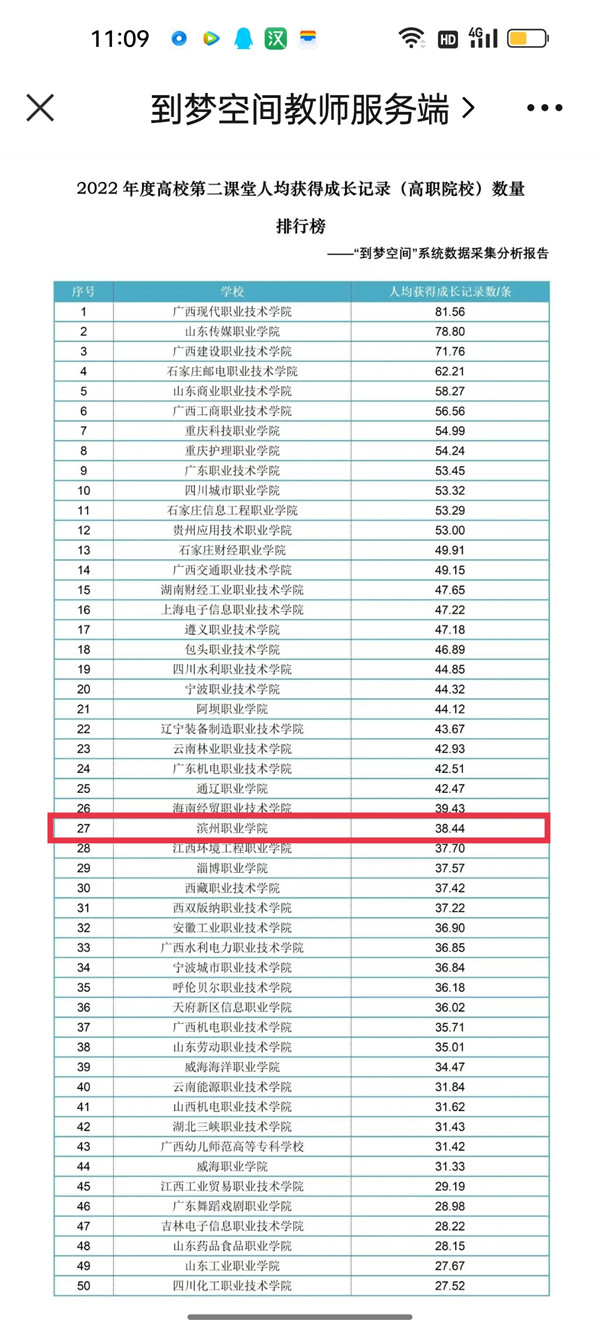 12月14日,团中央“第二课堂成绩单”到梦空间系统全国运营中心发布了第二课堂工作维度的年度榜单,我院第二课堂五个维度专项工作全部入选全国高职院校50强。其中,在平均活动参与度位列全国高职院校第9位,实际指导教师数量位列第12位,二课平均分数位列第16位,人均参与活动数量位列第18位,人均获得成长数量记录位列第27位。