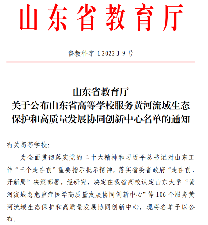 近日,山东省教育厅下发《关于公布山东省高等学校服务黄河流域生态保护和高质量发展协同创新中心名单的通知》,我院申报的黄河流域生物种质资源保护与应用协同创新中心获批立项,此为学院获批的第2个省级协同创新中心。