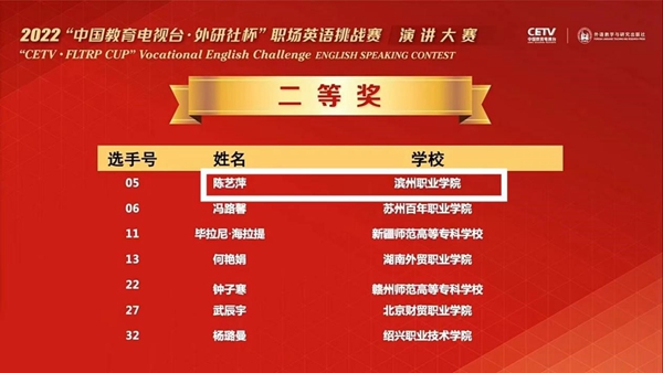 12月14日至18日,2022“中国教育电视台·外研社杯”职场英语挑战赛演讲大赛全国决赛于线上举行,全国共100名选手参加,我院2021级健康学院护理专业学生陈艺萍荣获全国二等奖。