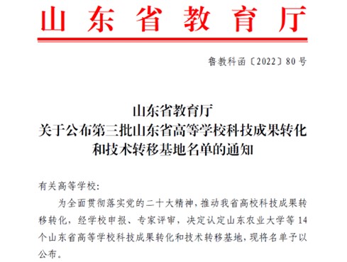 近日,省教育厅下发《关于公布第三批山东省高等学校科技成果转化和技术转移基地名单的通知》,我院成功入选第三批山东省高等学校科技成果转化和技术转移基地。