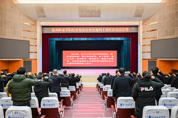 为深入学习宣传习近平法治思想,进一步弘扬宪法精神,树立宪法权威,营造全院学习宪法、宣传宪法、遵守宪法、维护宪法的良好氛围。在全国第九个宪法日来临之际,滨州职业学院以“学习宣传贯彻党的二十大精神,推动全面贯彻实施宪法”为主题开展“纪念宪法公布实施四十周年向宪法宣誓”活动。全院副科级以上干部参加活动。