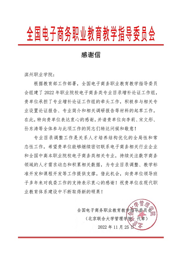 12月8日,我院收到全国电子商务职业教育教学指导委员会发来的感谢信,感谢我院多年来对全国电商行指委工作的大力支持,感谢我院李莉、孙东涛、宋文彤等同志在2022年全国职业院校专业目录增补论证工作中做出的贡献。