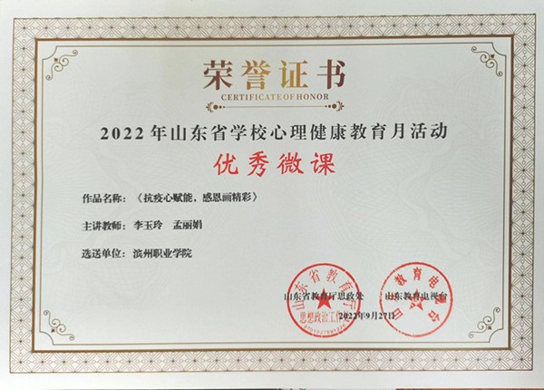 近日,由省教育厅主办的2022年山东省学校心理健康教育月活动评选结果揭晓,我院李玉玲、孟丽娟老师的作品《抗疫心赋能,感恩画精彩》在山东教育电视台展播并被评选为优秀微课。