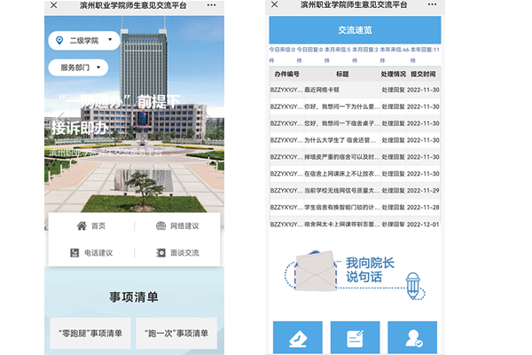 “滨职师生交流(投诉)平台”作为我校“智慧学生社区”建设的重要组成部分,以“数据多跑路、师生少跑腿”为目标,依托我校一网通办平台和融合门户,采用新一代网络技术,提高了问题诉求和问题解决的便捷性,诉求人可通过电脑、微信公众号等多种方式上报诉求,诉求办理结果以短信方式实时反馈至诉求人,实现了“事事有着落,件件有回应”。