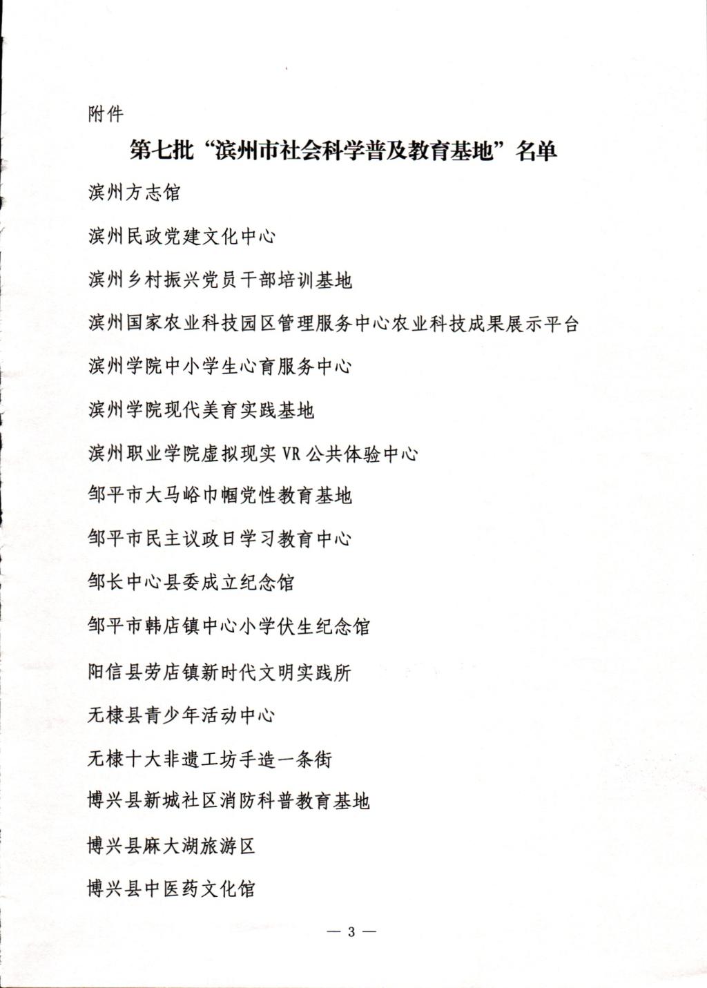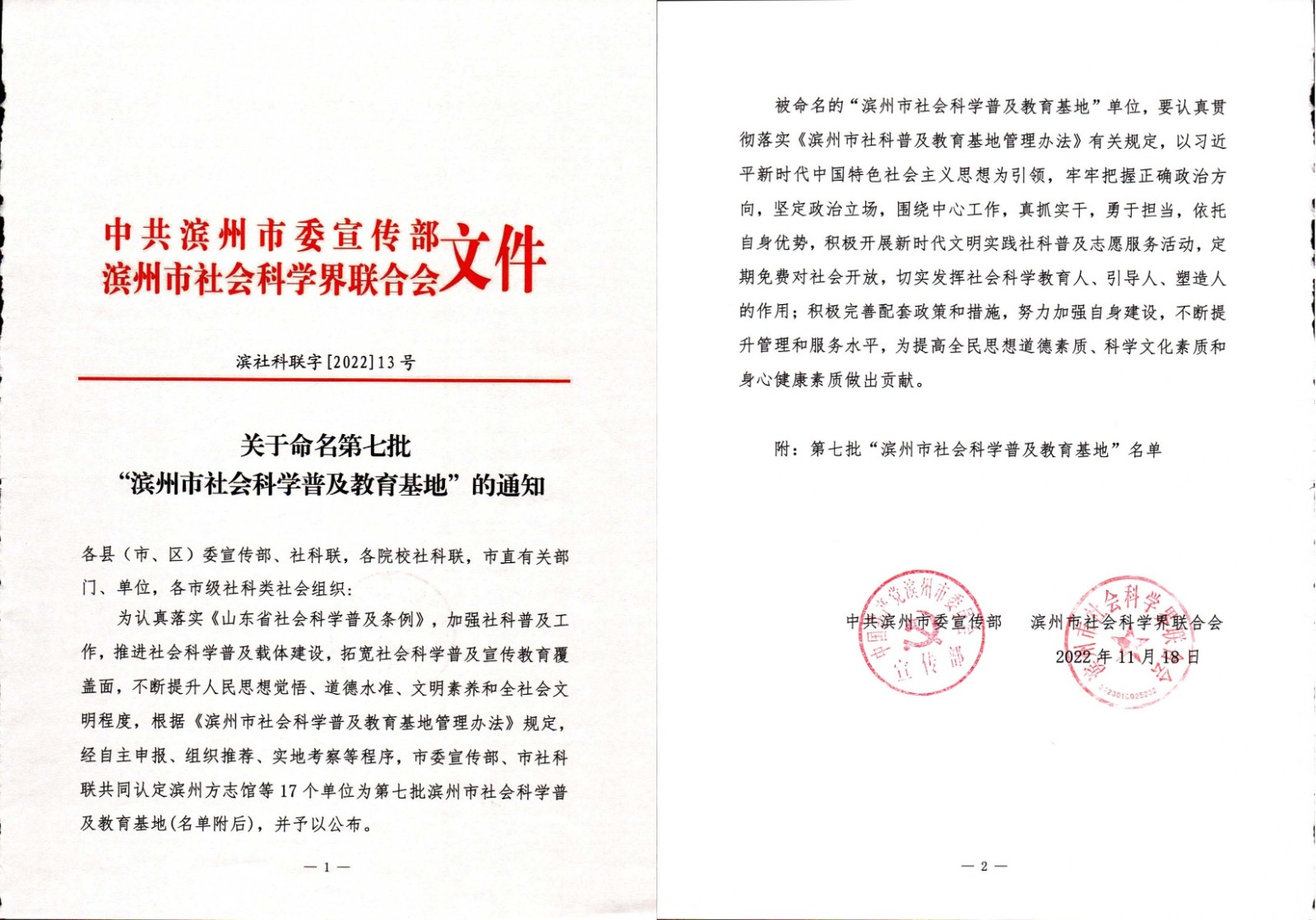 近日,为进一步做好社会科学普及工作,大力实施新时代文明实践社会科学普及志愿服务行动,深入开展新时代爱国主义教育,做到服务社会、服务群众、服务发展,根据《山东省社会科学普及条例》和《滨州市社会科学普及教育基地管理办法》有关规定,中共滨州市委宣传部、滨州市社会科学界联合会开展了2022年度滨州市社会科学普及教育基地申报工作,我院申报的“虚拟现实VR公共体验中心”被确定为第七批“滨州市社会科学普及教育基地”。