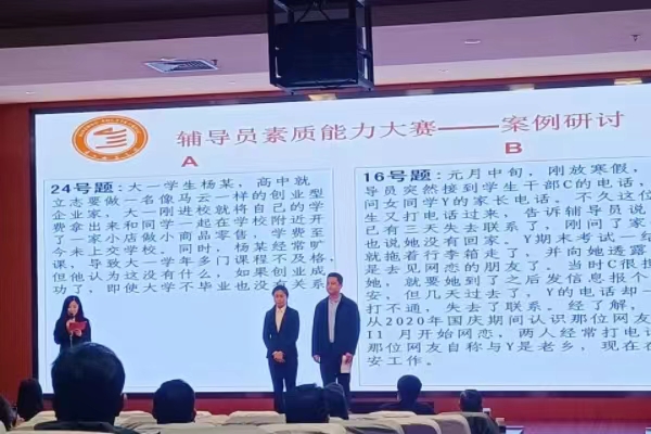 案例研讨主要考察辅导员综合运用理论分析问题、研判问题、解决问题的能力,两两抽签成组,采用“我提问,你回答”的方式开展。选手们结合所抽案例情境,就辅导员日常工作中涉及的理想信念教育和价值引领、学风建设、危机事件应对与处理、稳定安全教育管理、学业指导、就业指导、党团班级建设等各类工作内容,一同辨析原因、探讨对策、总结经验。参赛选手们既是对手、又要联手,既要出招、也要接招。在交流研讨中,选手们思维敏捷、思路清晰、导向正确、妙语连珠,展示了扎实的育人本领和突出的职业素养。整场比赛历时3个多小时。