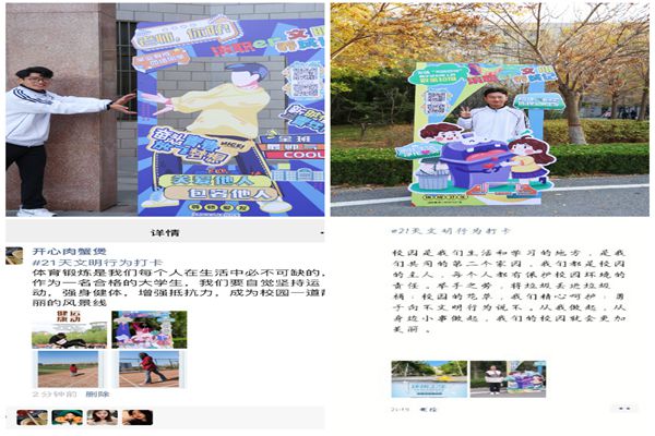 此次活动分别在校园内教学楼、图书馆、餐厅等处设置了7处打卡景观,内容涵盖爱护环境、文明餐饮等七个文明主题,每一打卡点设置拍照打卡处,并配有相应主题的文明标语和实践要求。活动期间,广大师生踊跃参与,纷纷到打卡处拍照留念,积极开展相应的文明主题实践活动,并通过微信、微博、抖音等个人社交平台晒出朋友圈,产生了良好的文明传播效应,让文明内化于心、外化于行。(宣传部)