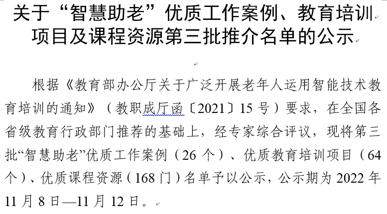 教育部职成司组织开展 “智慧助老”优质工作案例、教育培训项目及课程资源推介工作旨在汇聚各地老年教育资源,拓展老年社会教育功能,助力老年人更新观念,提升老年人运用智能技术能力,帮助老年人更好的融入信息社会,为老年人跨越“数字鸿沟”提供教育支持服务,增强老年人的获得感、幸福感、安全感。