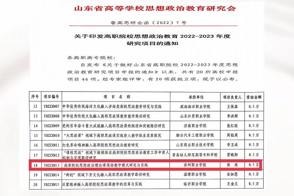 近日,山东省高等学校思想政治教育研究会公布了山东省高职院校思想政治教育2022-2023年度研究项目立项名单,共有20项获批立项,马克思主义学院思政课教师孙冉主持的项目《高职院校思想政治理论课现场教学模式研究与实践》位列其中,并获得经费资助0.5万元。