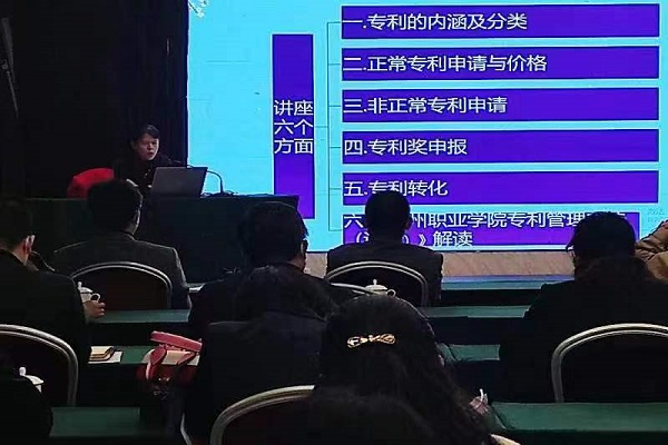 滨州市中科汇技术转移有限公司总经理张连科针对专利基础知识及如何申请专利进行了实战型的指导;就专利的类型、专利的特性、专利文件、申请的流程、专利转化进行详细的讲解,指导大家如何申请专利,引起大家的强烈的共鸣。赵春海教授用专业的知识,富有哲理的语言,鲜活生动的案例,从专利相关概念、专利挖掘方法、电子申请事项、专利费用减缴等四个层面深入浅出地为我院教师做了《专利挖掘申请与培育》报告。孟学英教授针对校企专利转化及《滨州职业学院专利管理办法》,从专利转让、科技成果转化、学院成果转化典型案例等方面作了深入细致讲解。