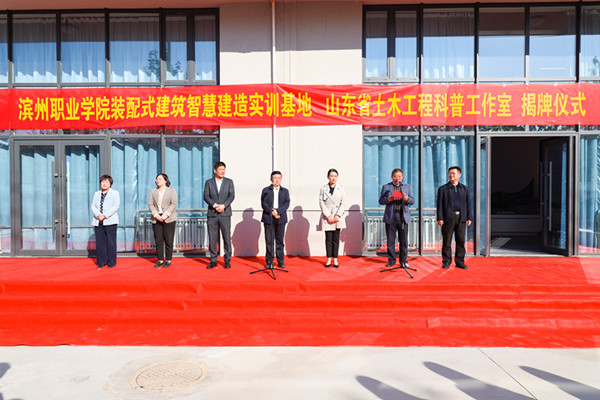 10月11日下午,我院装配式建筑智慧建造实训基地暨山东省土木工程科普工作室揭牌仪式在第二实训广场1号楼装配式实训室隆重举行。党委书记杨光军、市住房和城乡建设局副局长徐静、山东百库教育科技有限公司董事长高清禄等出席仪式并致辞,党委委员、滨州应用科技研究院院长胡洪涛主持。