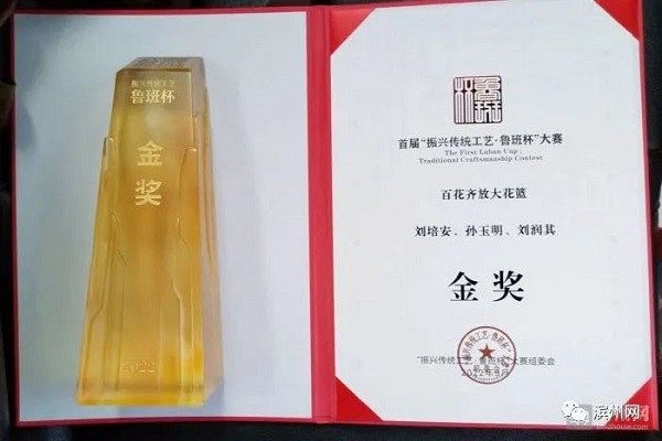 9月15日,首届“振兴传统工艺 鲁班杯”大赛颁奖典礼在山东手造(济南)展示体验中心举行。经过专家们严格、耐心、细致的评审,评选出了金、银、铜奖以及全场大奖。其中滨州市获得金奖的1件手造作品为刘培安制作的草柳编《百花齐放大花篮》。