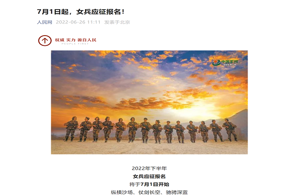 在6月26日人民网发布的题为《7月1日起,女兵应征报名!》资讯中,使用我院2017级女兵何晴照片,这是继央视影音、中国军网报道以来再一次出现在军方宣传内容中。自2017年定向培养女军士招生以来,士官学院逐渐摸索出一条培养优秀卓越的女军士之路,目前在校女军士10人,单独定制军事训练方案、体能考核方法,并配备专职女辅导员进宿舍管理,定期开展谈心谈话和心理团建,同时为女军士生开设绘画和舞蹈的特长培训课,为今后进入部队全方位发展、多层次突出做好铺垫。(士官学院)