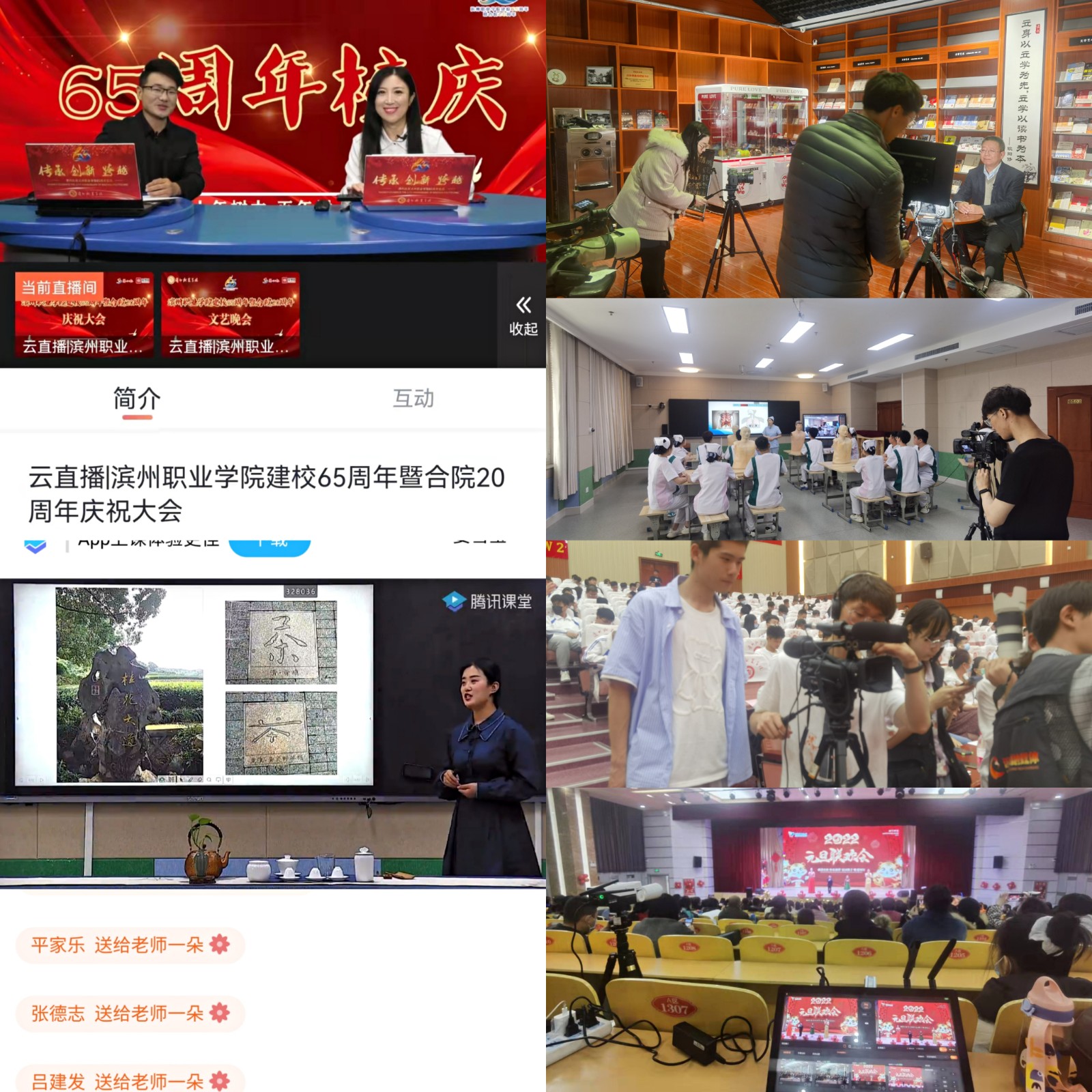 成立伊始,团队首先从学校教学所需的慕课、微课拍摄制作入手,制作视频120余部;支撑线上会议、竞赛与校内外直播活动百余场次,完成第二届海峡两岸(滨州)护理高峰论坛、康养国际论坛峰会、护士节、65周年校庆等大型直播活动,专业的技术水平、周到的服务态度得到一致好评。