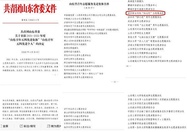 4月28日,共青团山东省委印发《共青团山东省委关于表彰2021-2022年度“山东青年五四先进集体”“山东青年五四先进个人”的决定》,我院“阳光吧”志愿服务队荣获2021-2022年度“山东省志愿服务先进集体”荣誉称号,全省仅有5所高职院校大学生志愿服务队伍入选。