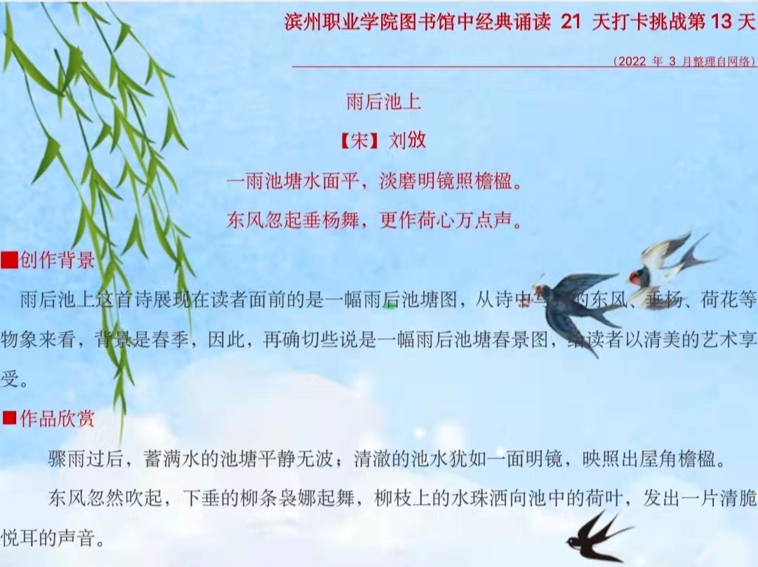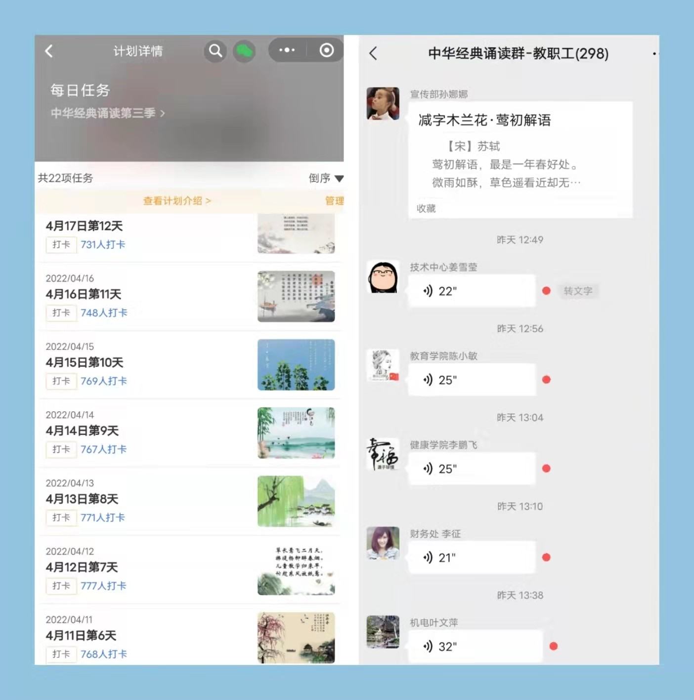 为传承和发扬中华民族传统文化,提升我院师生文学素养,努力营造浓厚的书香校园氛围,图书馆在第九届读书月活动期间举办了“中华经典诵读第三季(春天的诗)21天打卡活动”。此次诵读的是21首唐宋时期描述春天的经典诗词。活动期间师生们参与热情高涨,有时很早就打卡,有时很晚也不忘。从早春到晚春,从江南到江北,展现了一幅生机勃勃的踏春吟诗景象。该活动于4月6日开始,4月26日落下帷幕,最终有261名教师、790名学生每日坚持诵读,赢得胜利。