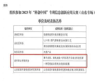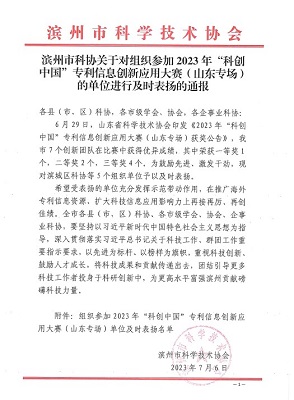 近日,滨州市科学技术协会印发《关于对组织参加2023年“科创中国”专利信息创新应用大赛的单位进行及时表扬的通报》,我校作为组织单位受到市科协表扬。