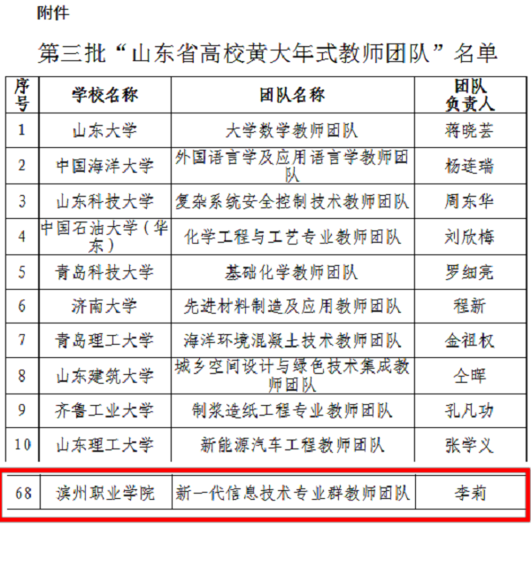 7月17日,山东省教育厅公布了第三批“山东省高校黄大年式教师团队”入选名单,入选团队总计100个,以信息工程学院院长李莉为团队负责人的我校“新一代信息技术专业群教师团队”获此殊荣。