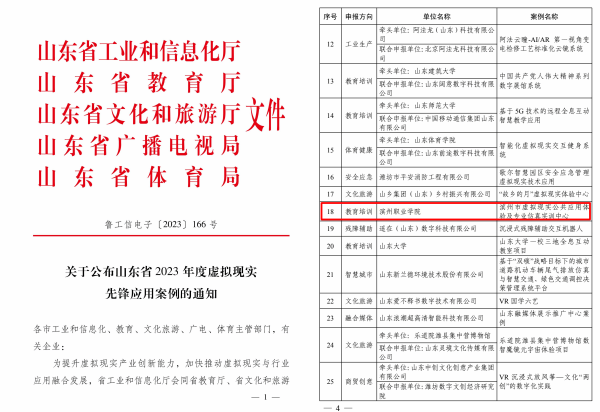 8月24日,省工业和信息化厅、省教育厅、省文化和旅游厅、省广播电视局、省体育局5部门联合下发《关于公布山东省2023年度虚拟现实先锋应用案例的通知》,我校申报的《滨州市虚拟现实公共应用体验及专业仿真实训中心》案例经申报、初审、评审等环节,最终成功入选教育培训方向虚拟现实先锋应用案例。