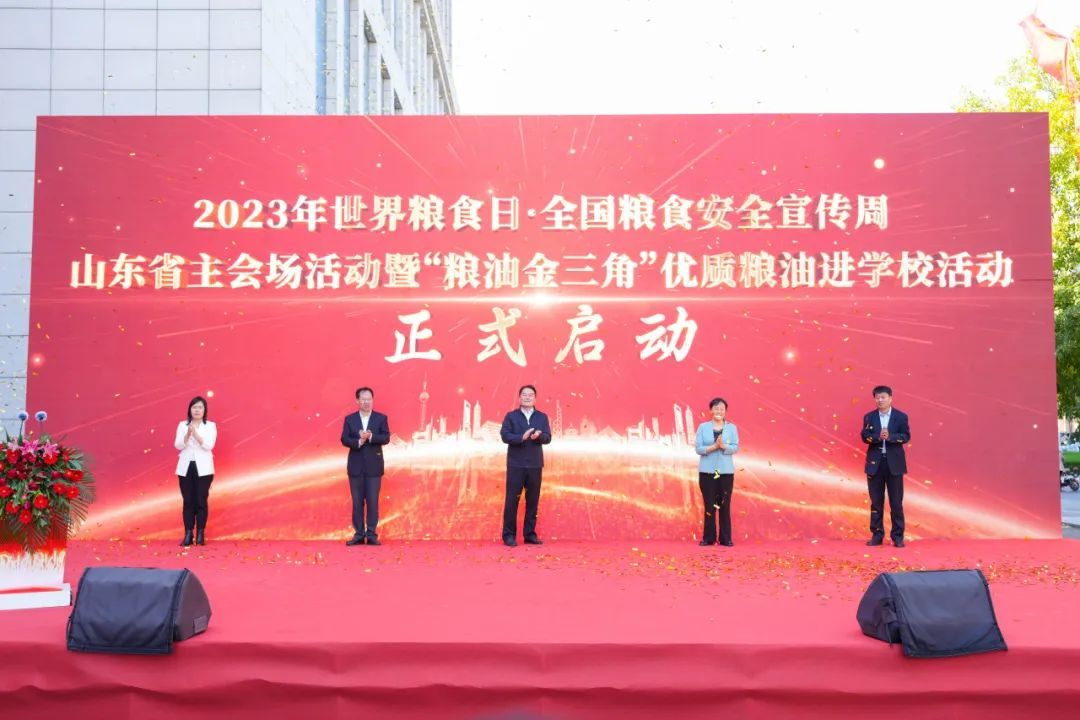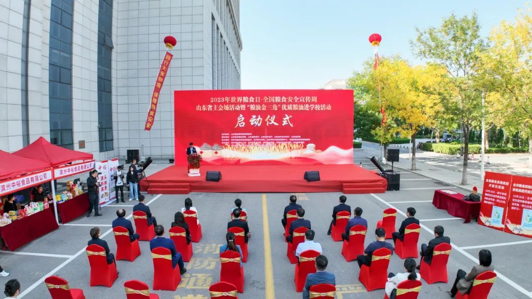 2023年世界粮食日·全国粮食安全宣传周山东主会场活动暨“粮油金三角”优质粮油进学校活动启动仪式在我校举行。山东省粮食和物资储备局党组成员、副局长王伟,滨州市委常委、政法委书记毕志伟,滨州职业学院党委书记刘荩一,山东省粮食和物资储备局政策法规处处长亓文霞,山东省科技厅农村处二级调研员杨书平,山东省农业农村厅种植业管理处三级调研员滕少明,山东省妇联家儿部四级调研员王文波,大众日报融媒公司综合开发部副主任宋伟,山东省发展改革委经贸处尹琪,滨州职业学院党委副书记范克志,滨城区粮食和物资储备局党组书记郭良及相关市直部门的领导出席活动。滨州市粮食和储备局党组书记、局长蔺兵川主持活动。