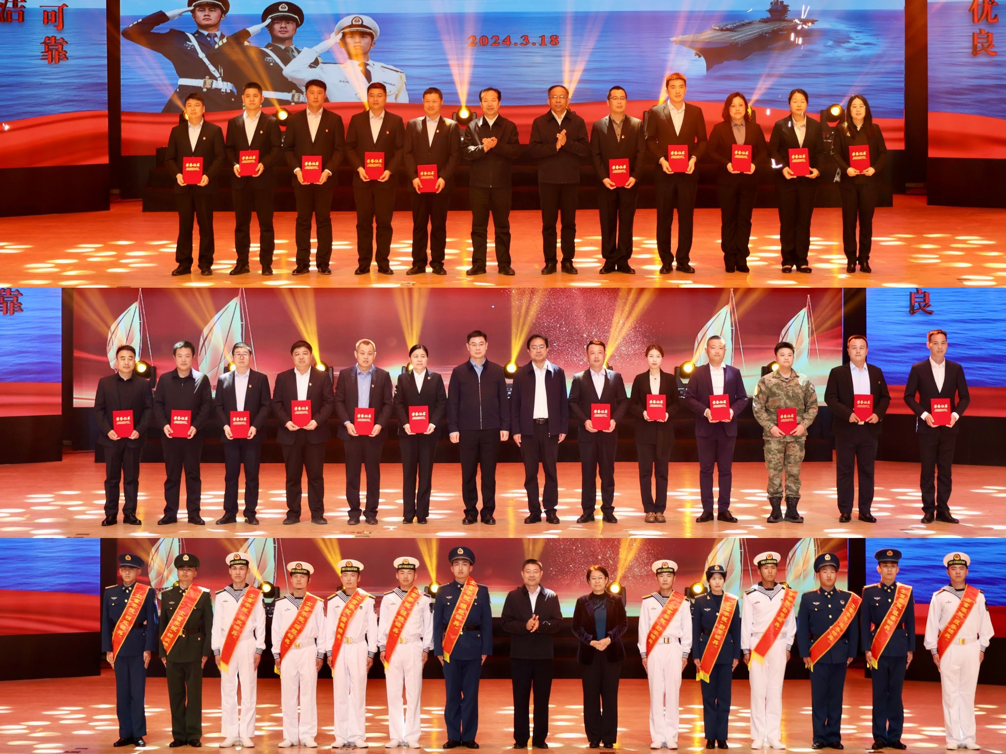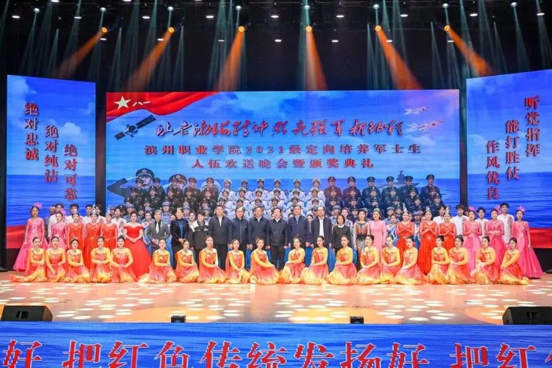 3月18日晚,我校举行“让老渤海精神照亮强军新征程”2021级定向培养军士生入伍欢送晚会暨颁奖典礼。海军、空军、战略支援部队接兵领导,党委书记刘荩一,党委副书记、院长申保忠,党委副书记范克志,副院长李明月,党委委员、副院长王进博,党委委员、纪委书记、监察专员吕海霞,党委委员、宣传部部长杨玉梅,党委委员、组织人事部部长李超,滨州市退役军人事务局党组成员、副局长李荣国,滨州海事局党组成员、副局长鲍新军,以及滨州军分区、滨州市发展与改革委员会、滨州市退役军人事务局、滨州海事局、滨城区人武部、滨州市公安局滨城分局、滨州市征兵体检站、滨州市渤海革命老区纪念园、彭李派出所等多家单位领导同志、家长代表、士官学院全体师生以及承担教学任务的二级学院老师现场观看晚会,全程共近两万人同步收看在线直播。
