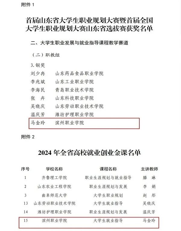 近日,省人力资源和社会保障厅、省教育厅公布首届山东省大学生职业规划大赛获奖名单,滨州职业学院马克思主义学院教学团队荣获大学生职业发展与就业指导课程教学赛道职教组铜奖,参赛课程《大学生就业指导》被确立为2024年全省高校就业创业金课。