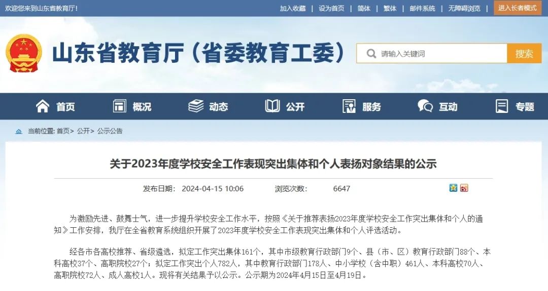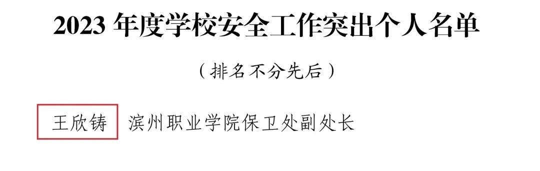 4月19日,山东省教育厅发布《关于2023年度学校安全工作表现突出集体和个人表扬对象结果的公示》,我校荣获2023年度学校安全工作突出集体,王欣铸获评2023年度学校安全工作突出个人。根据,市委教育工委、市教育局印发的《关于表扬2023年度全市校园安全工作先进单位和先进个人名单的通报》,我校荣获2023年度全市校园安全工作先进单位。