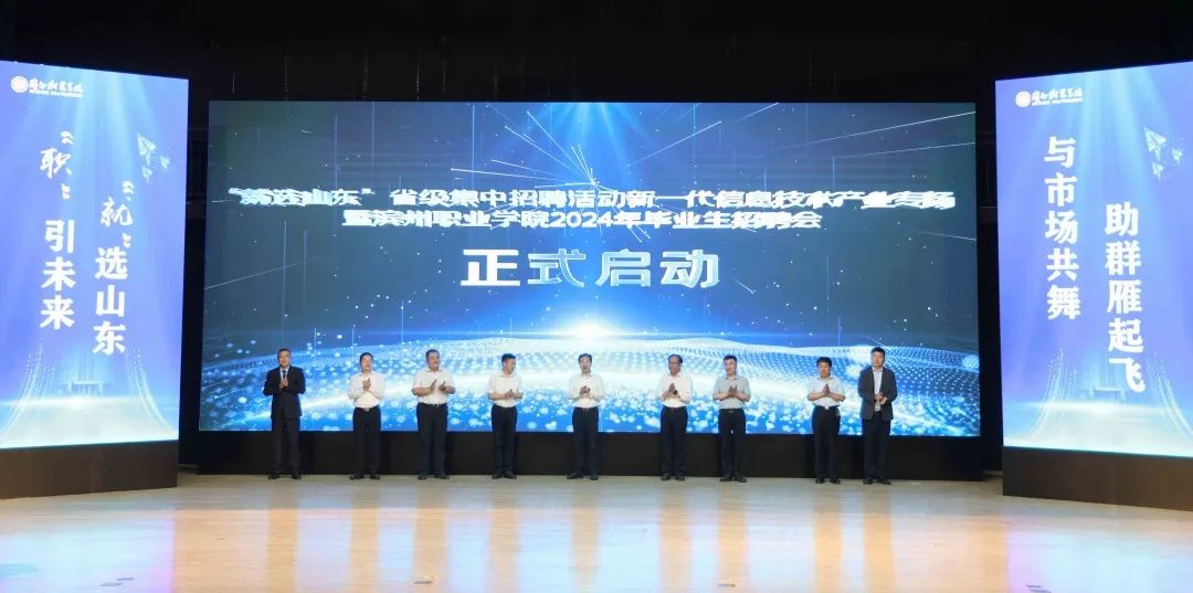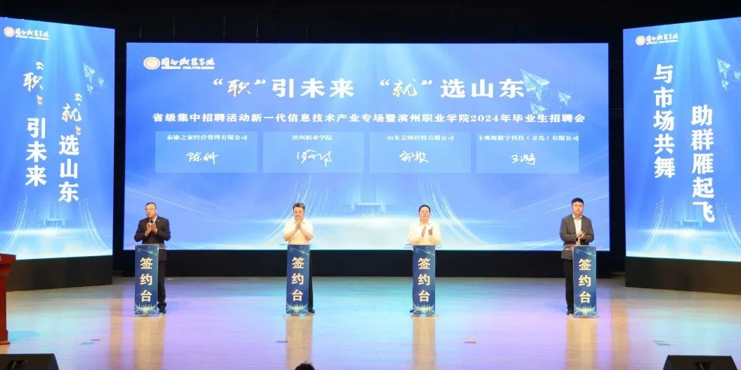 仪式上,学校与山东京博控股有限公司、泰康之家经营管理有限公司、卡奥斯数字科技(青岛)有限公司共同签约成立滨州职业学院毕业生优质就业基地。随后,9位与会领导共同按下触摸屏启动招聘活动。